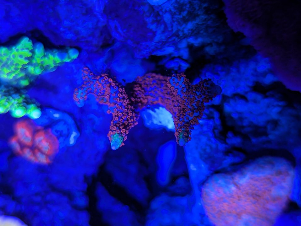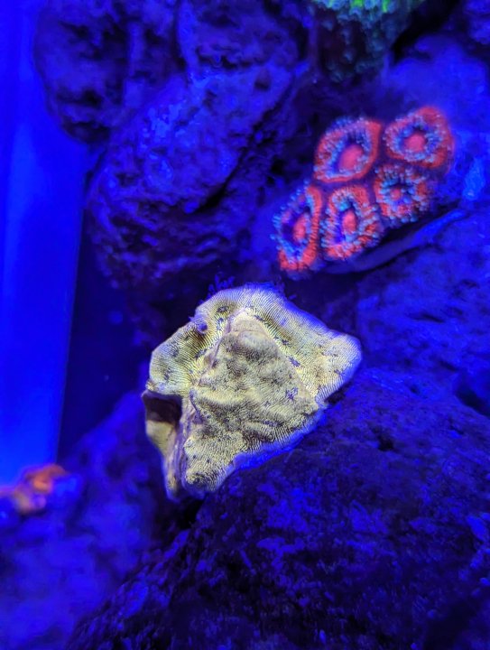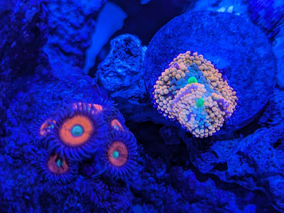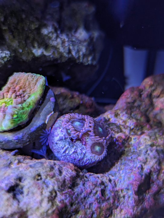 The “CR Hot Tuna” zoas are nice but may look better as a big mat. The centers aren’t inky black in the white light and the pink rim is nice but it isn’t as bright as most of the other things in the tank. I’ll let it grow out a little and reassess. I may eventually end up passing on that one.