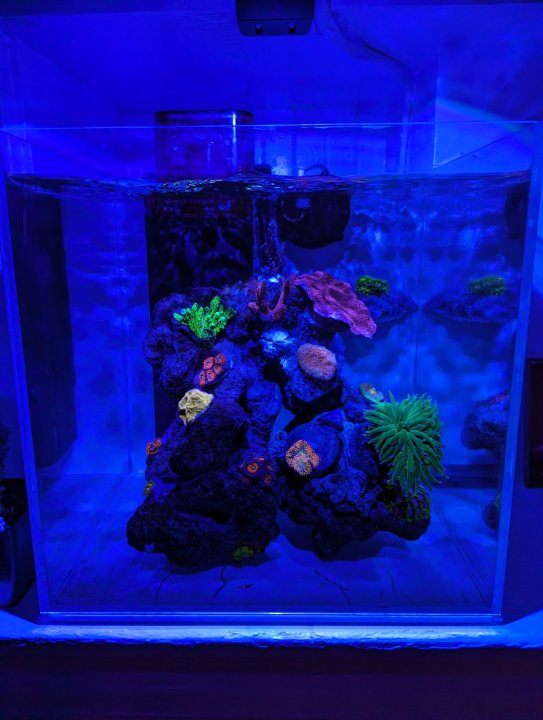 I bought some corals online. I got stuck in a cycle of shopping for expensive chalices, but balked at spending that much money on something I haven't seen before. I felt like I had to break the fever. I ended up getting some zoas, a tyree red watermelon chalice, a rock flower anemone, and a pink cadillac acro. I tried to get things that were versions of things I’d seen before but my local shop didn’t seem to have.