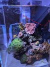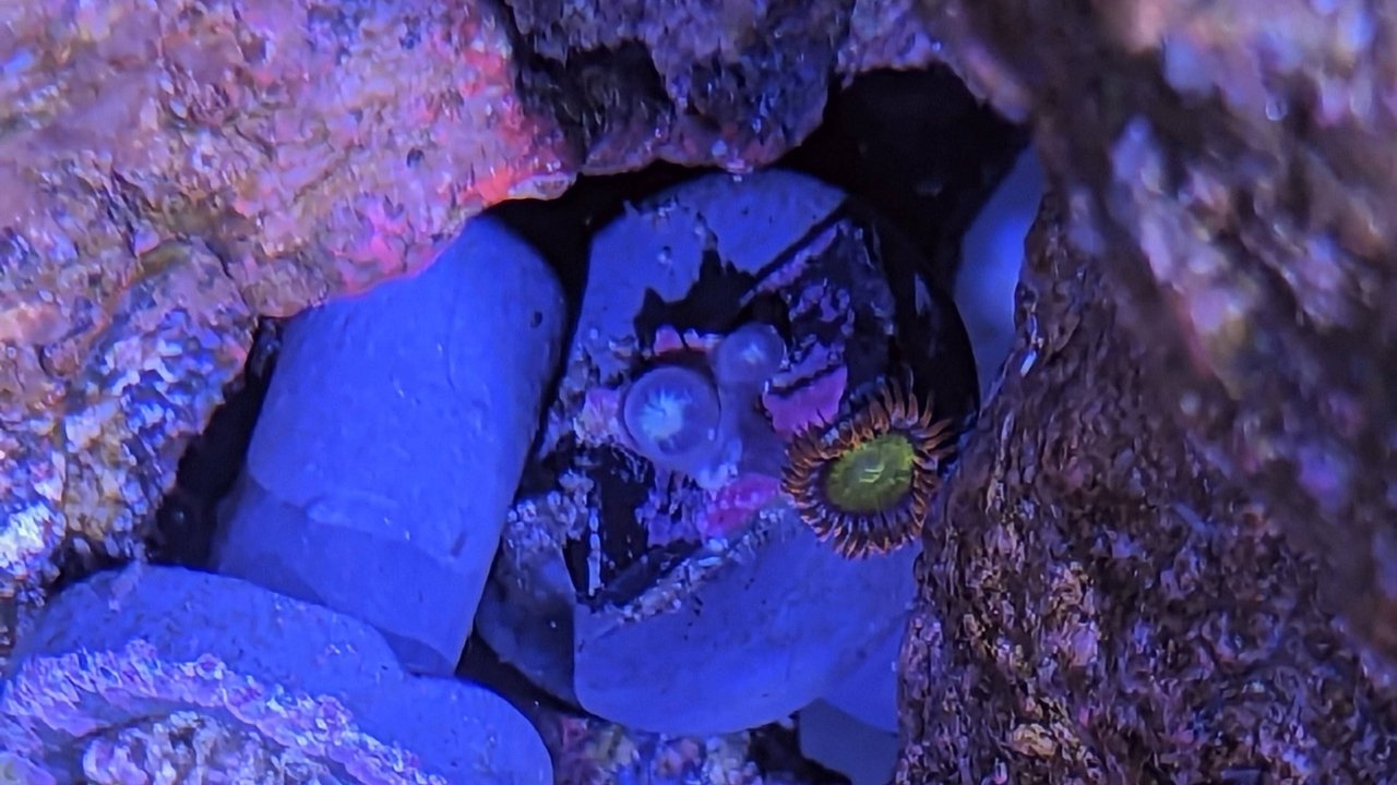 I had never heard of rock flower anemones until recently. The pictures were pretty impressive. I didn’t recall seeing them in local shops, but I may not have known what to look for. I like this one. It wandered off the ledge I initially put it on. I’m pretty sure it didn’t like the flow. It moved again after I sloshed it around pretty good during a water change. It seems to have found a place it likes, but it’s wedged under a rock. One the one hand, I like that it’s in a spot that I would otherwise not be able to place it and it’s got a little spunky character in that it just goes where it pleases. But, on the other hand, it’s in a place where I can’t feed it and it doesn’t get direct light. Hopefully, it won’t get too big or wander too much. I’m willing to be convinced that it’s irresponsible to have one in a tank like this, but the little research I did made it seem OK.