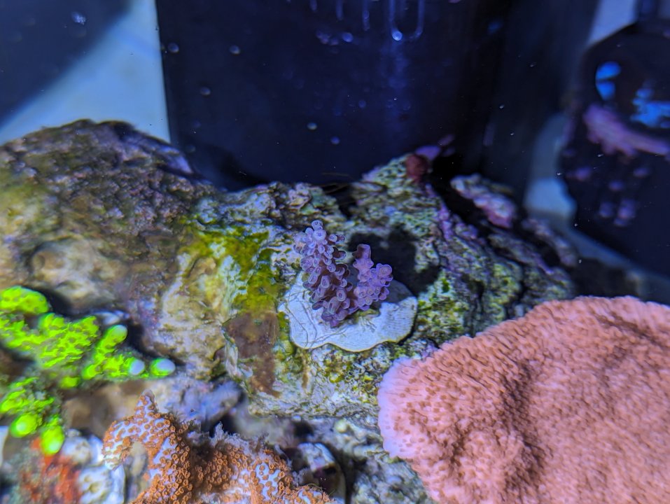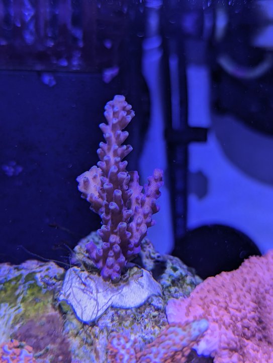 I feel a little bad getting an acro that has a high chance of dying, but it was only $10 and I got the impression I was practically doing someone a favor by taking their yard clippings. The acro has suddenly made me crazy about flow, which I’ll make a separate post about. I fiddled with the powerhead and it ended up blowing straight at it. After about a day, I could see it was bleaching where the powerhead was hitting it. About 24 hours later, I moved it to another spot just a couple inches away with less flow. That seems to have at least stanched the bleeding. The day after moving it, it tentatively looks like it’s slowly regaining color in some areas. This picture is from right before the bleaching. The right two growths turned completely white. My hope is that I can use this acro to learn on. I’m a little intimidated by them. I know it’s very early to add them, but for $10 I wanted to see what happened and maybe learn something along the way. High Tide Aquatics has an acro that I’m really excited about with a deep purple base and green tips. When my tank is more mature, I’d try one of those in this same spot and hopefully use my experience with the “RRC Pink Cadillac” to make that work.
