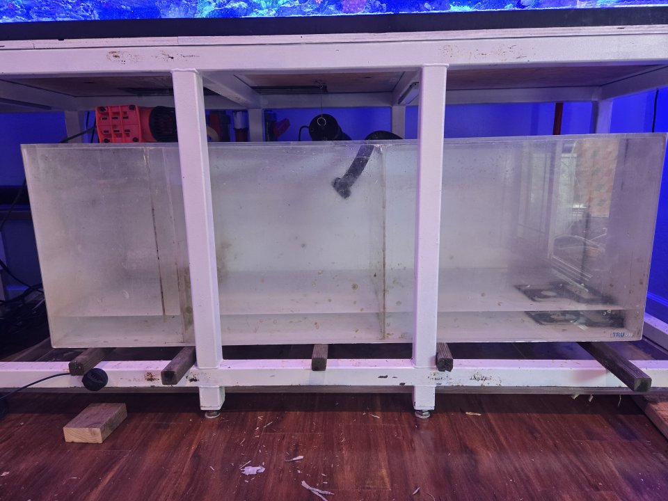 The sump sits on top of 4 pieces of 20x2x.25" thick acrylic that don't cover the whole bottom. I should have not skimp out. Going to add more acrylic to the bottom. Its a bad design.
