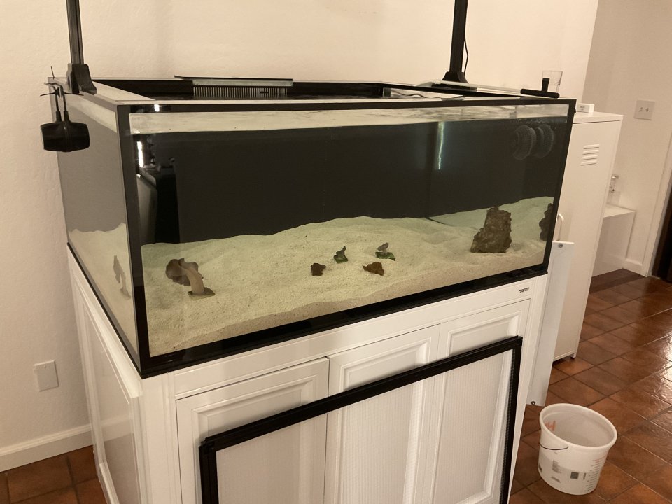 - Added 160 lbs of Special Grade Ocean Direct sand. It seems like the BRS sand calculator was pretty correct in giving me a 2-inch sandbed (not fully aligned on the picture). I bought this from Aquarium depot in Sacramento. A very impressive store, but this was more a one off event since I was in the area.
