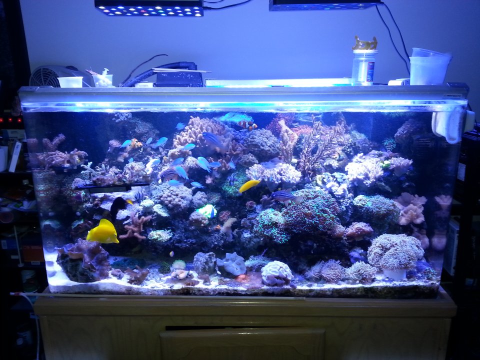 update - not much updates since I started a new job 7 months ago. I did lose 2 clams due to corals actually smothering them! I just didn't notice. Also lots of aptasia popping up so I have to take care of those. I will try to post a new pic soon, but I did setup a new 7 gallon tank at work with extra coral from home. : )