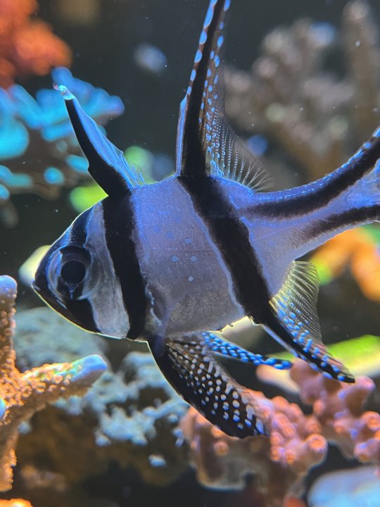 The only bad news so far is I cannot find the male. I think maybe I should have not put him back in the display so soon. What I found online was mixed info. Some said if they stay too long they will start eating the baby fish. Others said you should wait till they are eating again. The only fish I have that chase the bangai's are the other bangais. No one else messes with them. I can find the large female and the small female. The male has not come out since I put him back in the display. I am hoping he is just recovering and will come out soon, but it has been 3 days. I did read some of them will succumb from stress since they have not been eating for over 20-30 days. It is not looking good, but we'll see.