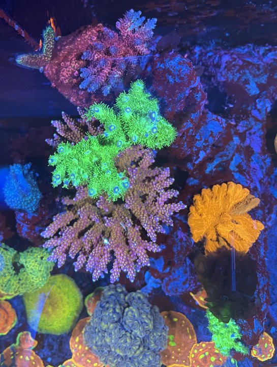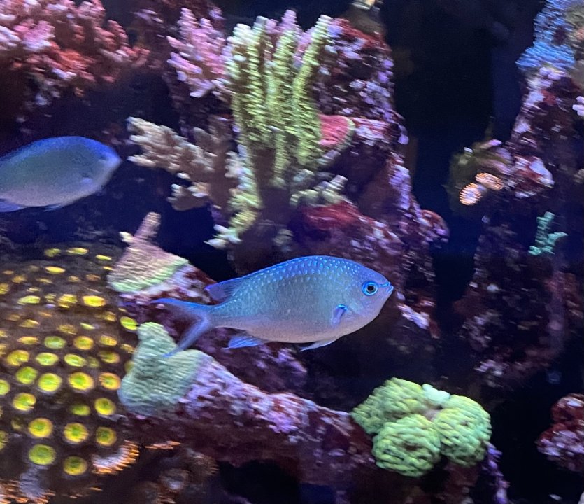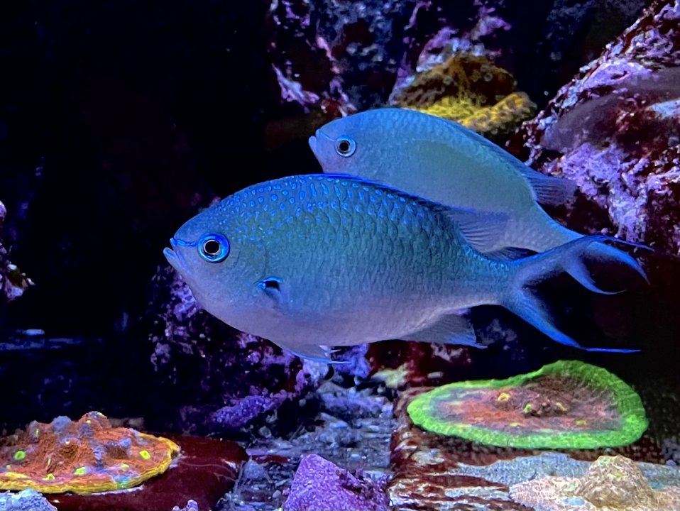 The chromis in front is a black axil variety, the one behind is a blue-green. The black axil is like an amp-ed up blue green chromis: more color, larger, more aggression and more active with longer streamers. If the marine biologists hadn’t decided these are different species, I’d have guessed the black axils and blue-greens are just male and female of the same species.