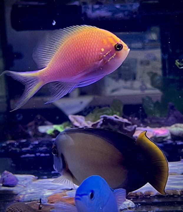 I have an update on my quest to add fathead anthias to my display. First, the anthia I got from Diver’s Den Sept ‘21 is doing great in the frag tank, although he only eats frozen food. I haven’t tried to restrict to only flake to see if I can convert him though. Trying to grow him out so he’s ready for round two against the display chromises!