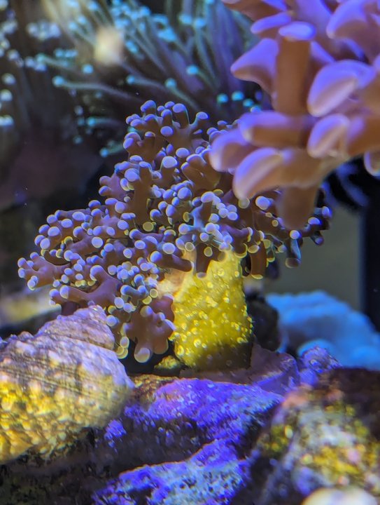 How did you attach to the back wall, just super glue the frag plug on there?I've got a meteor shower cyphastrea I glued on there that's spreading out nicely. The only thing I don't like is the raised spot where the frag started, so I might chisel it off later.
