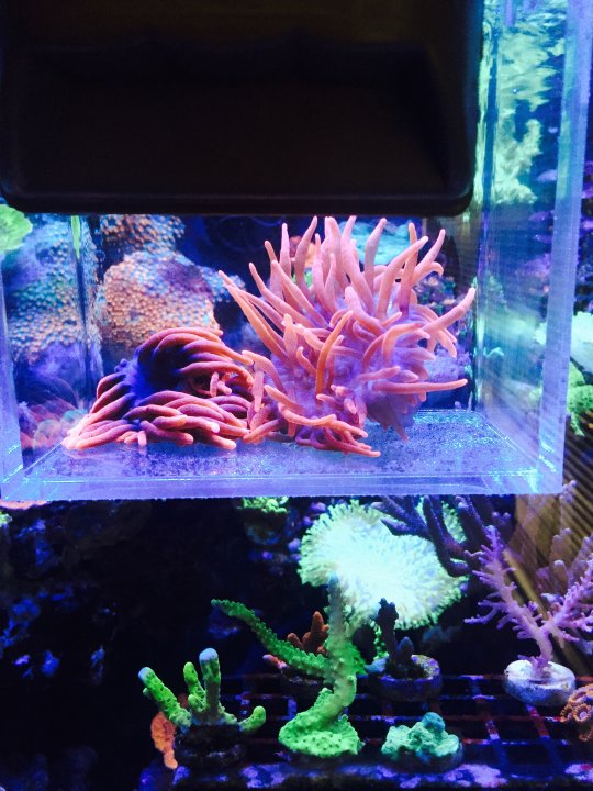 I originally purchased my RBTA in 2000 and I have had the RBTA split numerous times from then till now and after joining BAR I will like to spread it around within our club. These anemones are VERY resilient and have been through a lot including several moves. They have been exclusively raised under Metal Halide w/ VHO. But as of couple months ago, I have switched their lighting to LED. (to save on electricity) (plus, I was curious how they would do/look) A little of their color was lost when i changed lights, but is coming back. Their tips have not bubbled up in years. They may or may not bubble in your tank. The other day I noticed a recent split that was wandering around the glass. So i grabbed him and put it in a container. Little "Rosey" is ready for a new home.