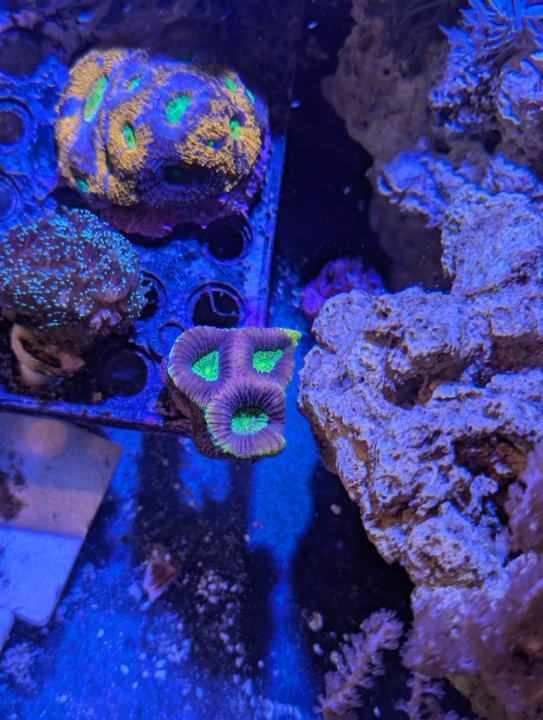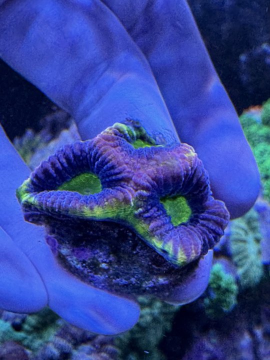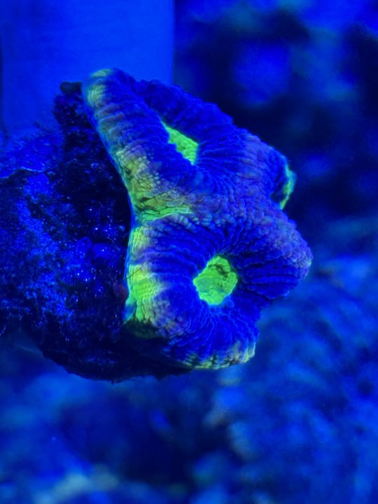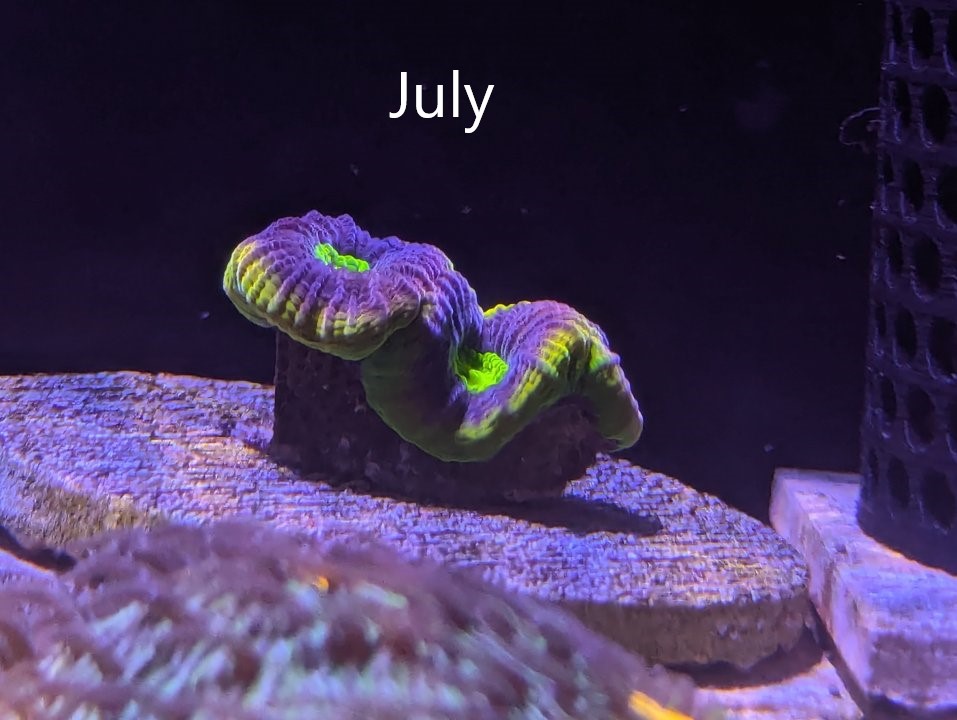 Still alive and milestone achieved - flesh on one of the polyps is now touching the base of the frag plug: