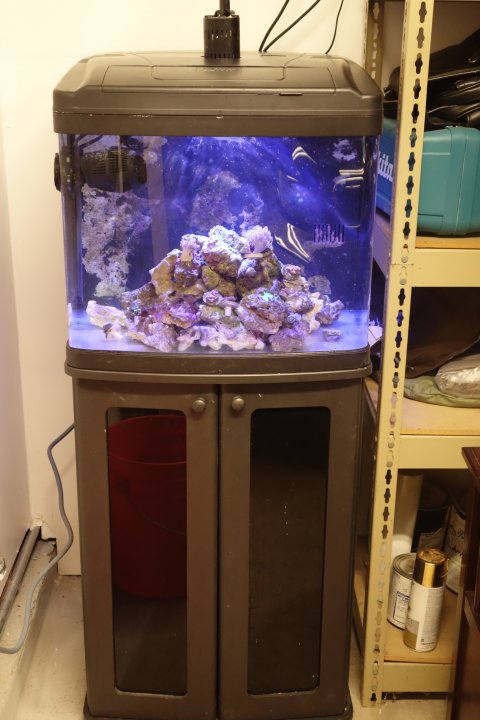 I guess I have lots to update; been slacking a bit. Last weekend I picked up my future quarantine tank: a 29g Biocube. Along with the heater, light and pump, also came with a bunch of frags piled amidst some live rock. I basically did as planned, siphoned out and saved most of the water. Placed the corals in tupperware, live rock in buckets. I dumped out the sand. Drove it 20 minutes. Set it back up in the garage and topped off with my new salt water. Went smoothly and much easier than I thought. Once my main tank is ready I'll move out some of the frags and have it ready to go as my quarantine tank -- bare bottom, sparse, and lonely.