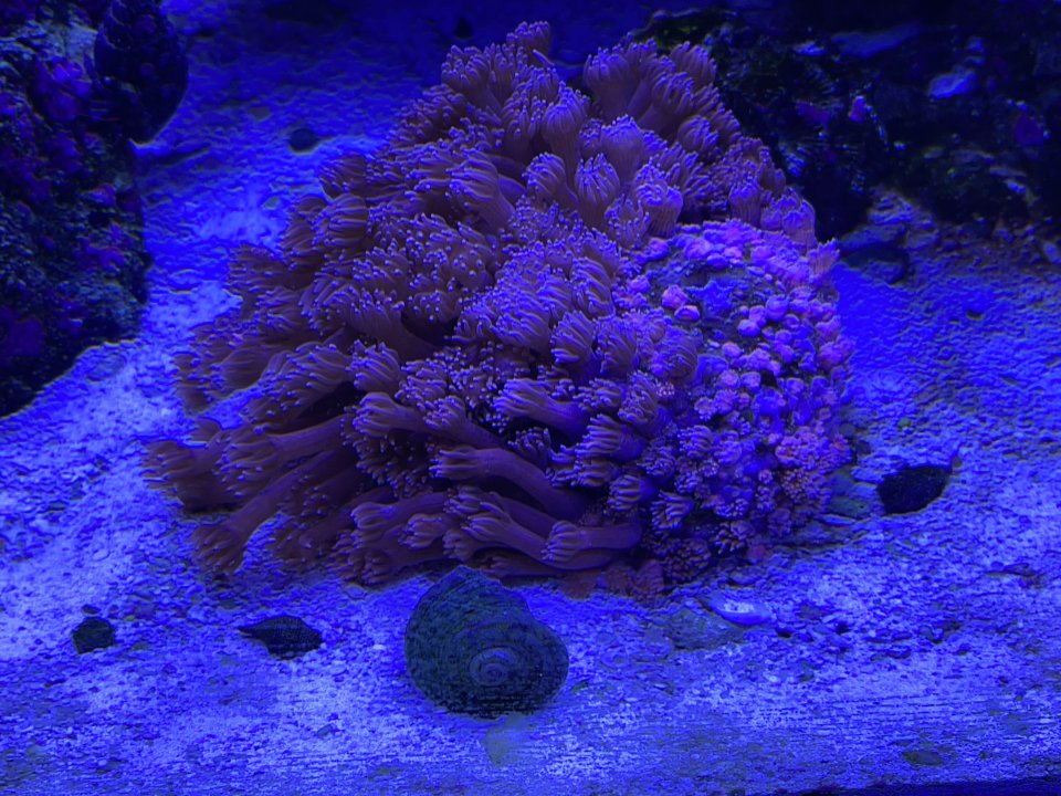 At one point I had it in my fish QT tank. It had shriveled up, and I thought it was going to die. I was going out of town for a week and did not want it to foul the water. I moved it into the QT tank (no meds in the tank, no lighting, no filtration, crappy water quality). It was still alive when I came back. Put it back in the main tank (waterbox 60) and then transferred it to the waterbox 180 when it was running. Prior to adding wrasses I had a huge flatworm problem. They seemed to like to swarm on this coral keeping it from expanding its polyps. Every day I had to blow them off with a turkey baster and I could see an occasional polyp bail out and float away. With the addition of the UV filter and wrasses the worms seems to be gone (at least I don't seem the on the glass, rocks, or sand anymore). Probably still there in small numbers. The other day about a 1/3rd of it was not expanding well and the polyps looked bleached (see the pic above). It lasted about a week. Don't know what happened, but now it is fully recovered again. Easily over 100 heads on this. It loves being in the current. I will post a videolink below.
