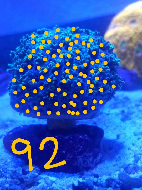 Here are my pics for this month...it is getting harder to get the polyps to retract enough to get a great count. When fully open it is stretching over 7" wide and polyp "fingers" open large enough to surround my thumb.