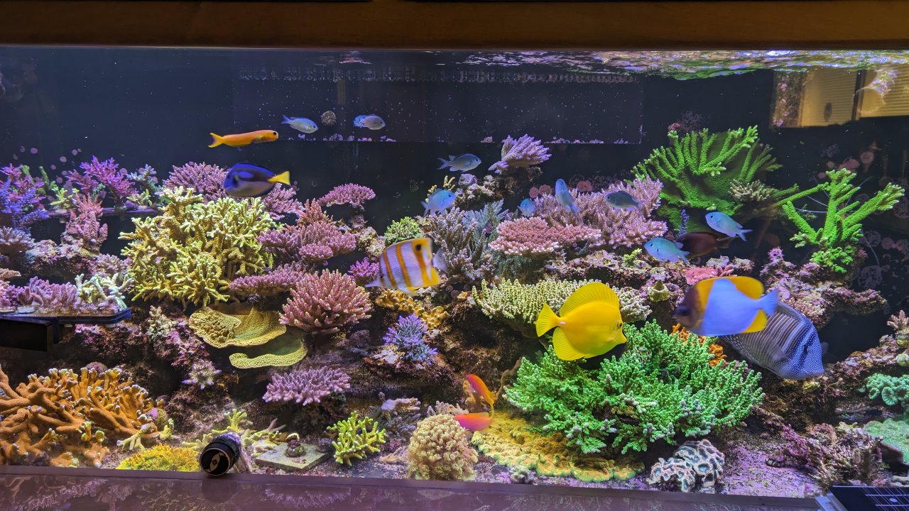 Auto feeder with freeze dried mysis shrimp for copperband butterflyfish and Avast Plank auto feeder with more mysis, calanus, Hikari Seaweed extreme pellets, TDO chromaboost pellets multiple times a day to keep healthy anthias and chromis.