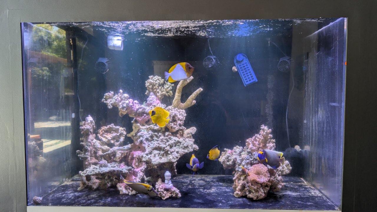 Woah those are some beautiful fish!Here's the initial setup, in 2020, and the latest (just re-aquascaped).