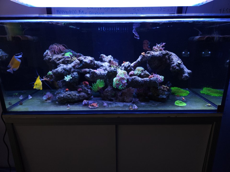 Makes sense that it would have to go through the cycle of crap that grows on a new surface in the system. The glass was dry for several days during the move in January. No I expect to see more coraline start growing there as long as I avoid any big nutrient changes.