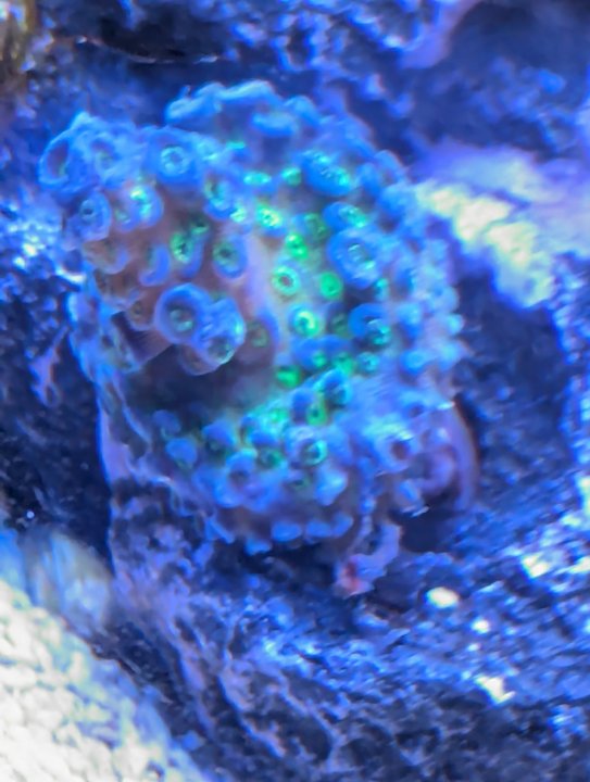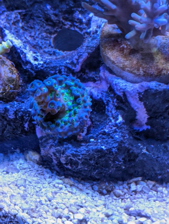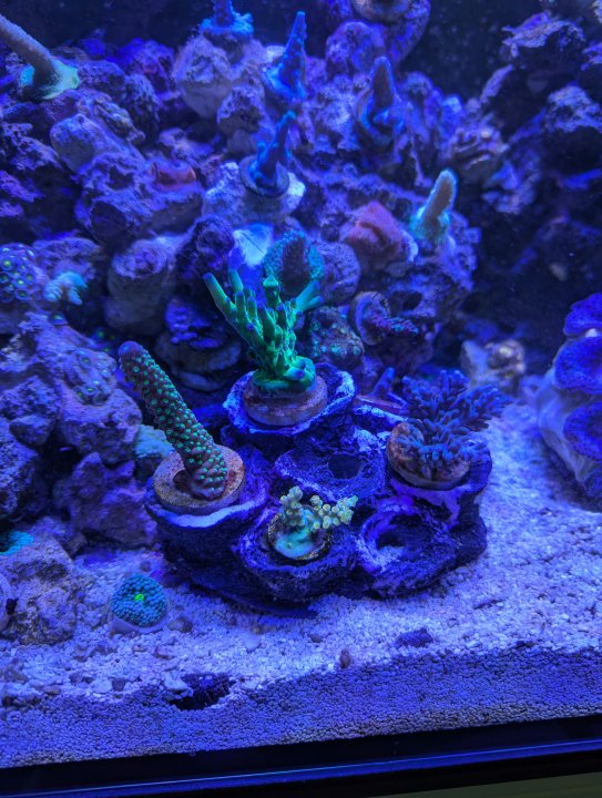 Here's what they looked like early on. The green polyped stag used to be blue. It's turning purple base with green polyps. The dark blue above it is a blue hoek (matrix) from Battle Corals. I would highly recommend him (Adam)!