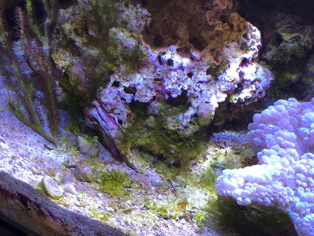 Big tank not great - coral still bleached. Hair algae and bit of caulerpa growing on rocks and some pale green on sandbed in some places that forms small mats with sand. Green mat: