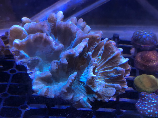 Hollywood Stunner Echinophyllia differences - huge one is pale and overlit I think - compare to frag below it that has been growing on the sandbed. In person they look very pale vs dark:
