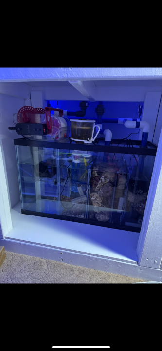 Your tank looks awesome!Frag tank is FULL. Need to start moving things over to my display but I’m always scared transferring coral lol. Last time I just YOLOd it and moved everything over. I need to get some supplemental light bars to help light around the edges since I keep coral there. I’ve noticed the torches around the edges have colored down some. I can’t increase the PAR in the edges without the center being really high. Maybe if I raised my light fixtures more… Also I hate how the LEDs show up on the surface so I’m getting new lights for this tank anyways