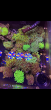 Haven’t posted an updated pic in a while. Picked up a few coral along the way lol. Torches a little crowded but hoping to move things to the display soon. I picked up a couple “NY Knicks” colonies yesterday that I think are Gold torches since I’m not seeing a green mouth. Dude gave me a steal though so I’m not upset at all. They’re nice torches :) I fragged them up and ended up with a dozen frags, most multiple heads, and had to make them fit. Gotta make room for 1 more torch im getting from @Invictus tomorrow lol