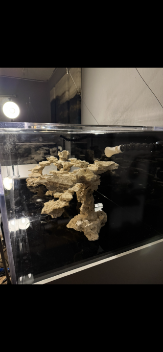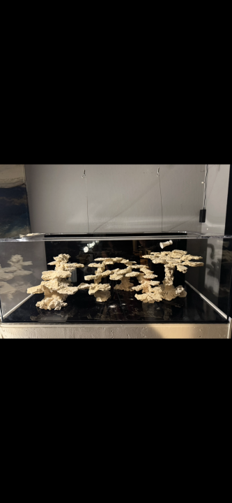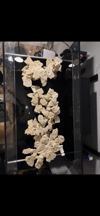I’ve been playing around with the 4 structures and I think this is my final placement. Leaves me a perimeter around scale to clean panels. Some space in the back to fill in with live rock. Space in the front to put some sand corals. Definitely want a Zoa rock on the front right side of the tank. If there’s anything I could change about this scape is I would’ve made the tree structure on the right a couple inches shorter. It’s too close to the RFG nozzle and probably going to get some pretty high PAR there. Maybe I’ll end up starting some SPS and placing it there.
