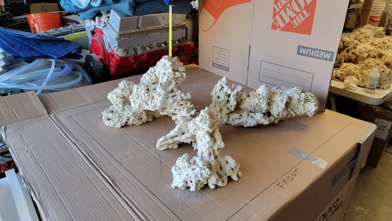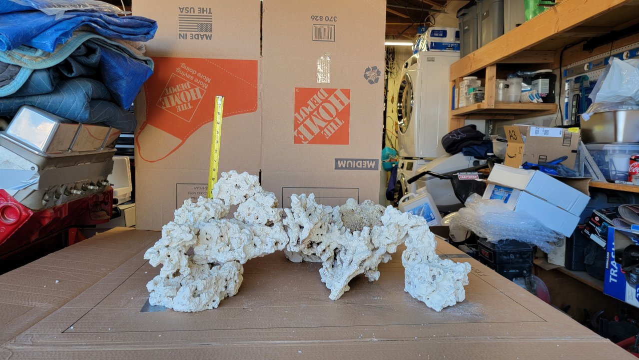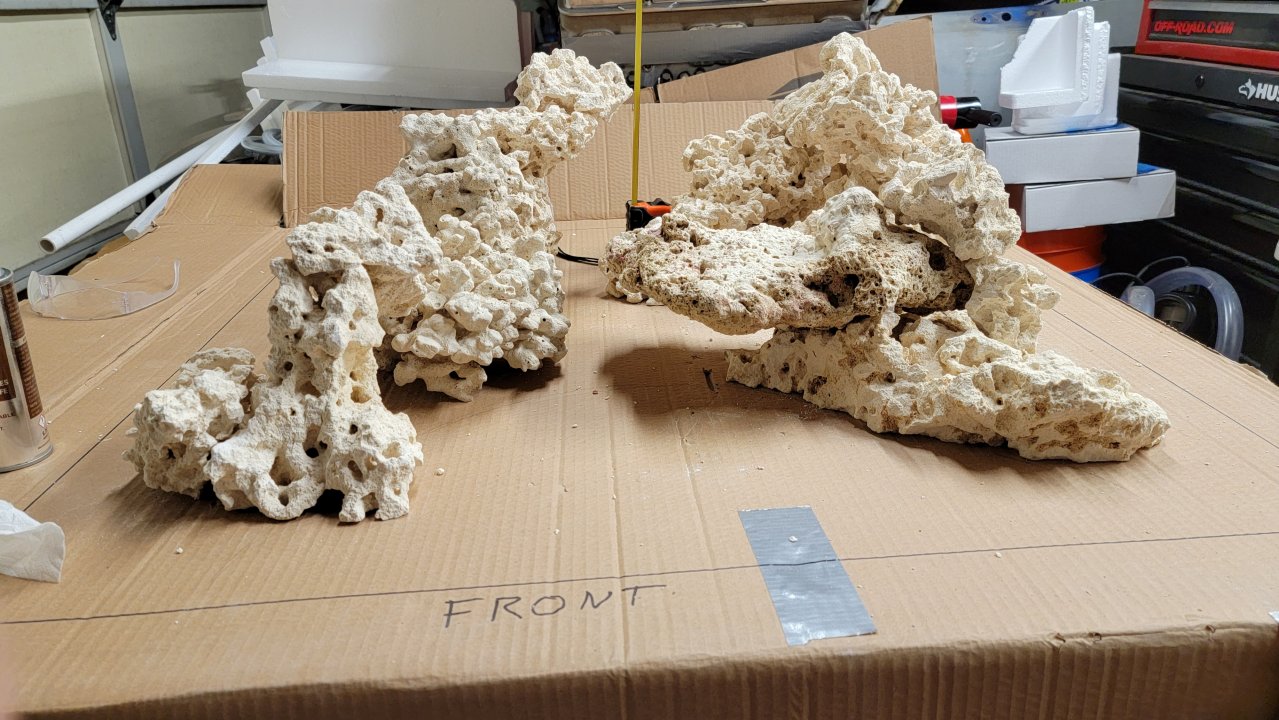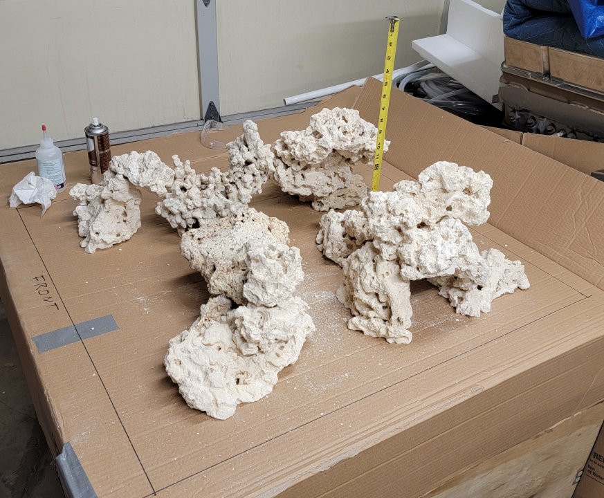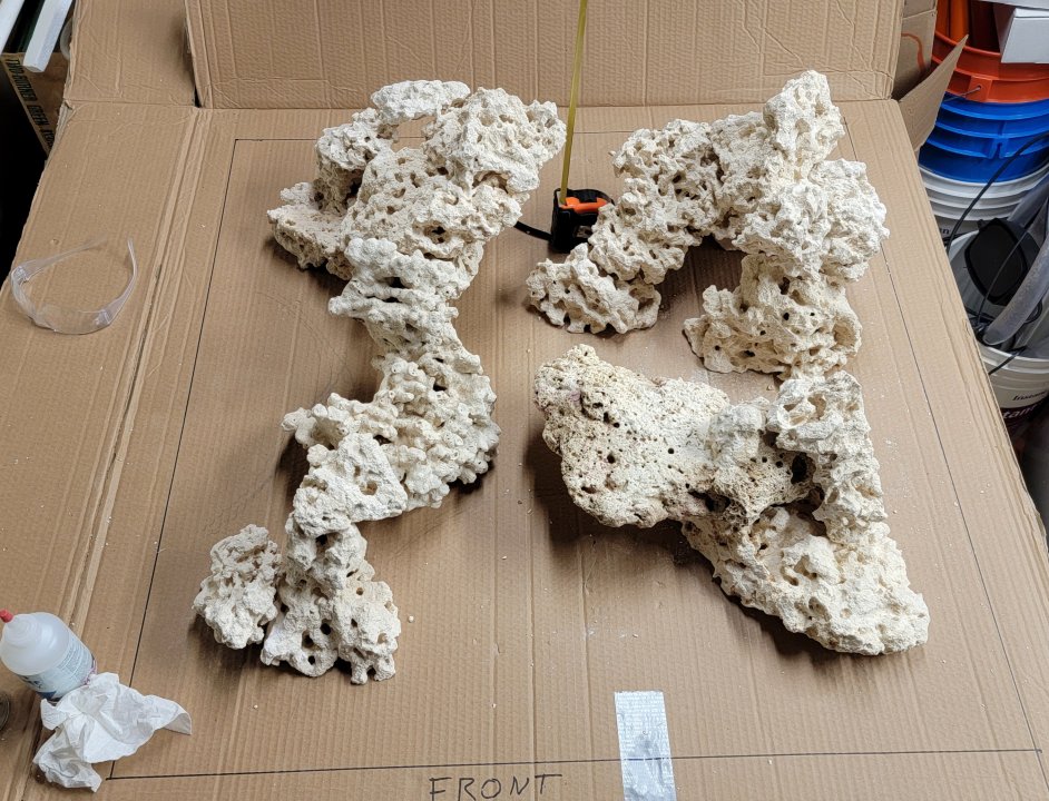 The start of my scape. Obviously a long way from done, but looking for suggestions. Not married to any of this, though I do think the "left" view looks pretty cool and gives lots of room for coral. The left and front views will be most prominent when the tank is up and running. End of tape measure is set to the approximate water level.