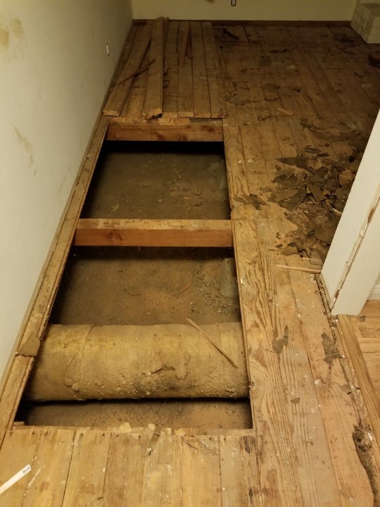 We had to get under the floor to dig some holes where new concrete footings will go. The sub floor is 2" thick, interlocking tongue and groove. This means the floor by itself can support a large load. The beams under the sub floor are 4"x6"s at 4 foot on center. (I will double check with my GC later on these numbers). Even though the floor is strong, it likely isn't strong enough to put a car in my living room, or in this case a reef tank which weighs more than my friends Miata.