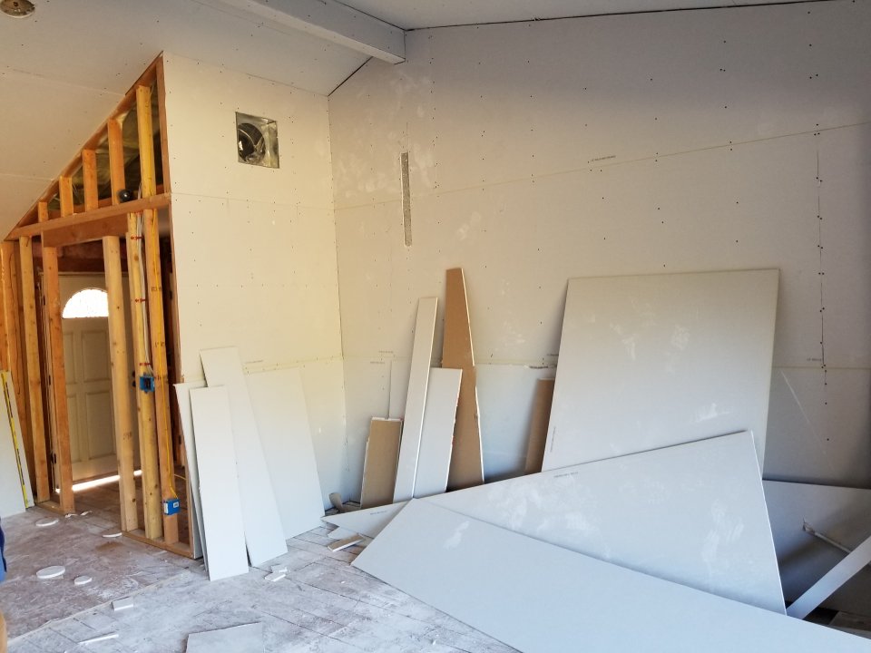 The subfloor was filled back in, and some lumbar added to support the ridge beam, which holds up the roof. We also framed out the window for the pass through on the tank. We let the kitchen designer make the house the way that the house should feel without the tank, then we designed the tank to fit the remaining space. We worked with the electrician early on to get extra outlets with high gauge wire to the tank. We also added some additional strength to the ceiling over the tank as we were thinking of doing a hanging lights at one point, but that was a very far distance to hang, so we went another direction with the light mounting.