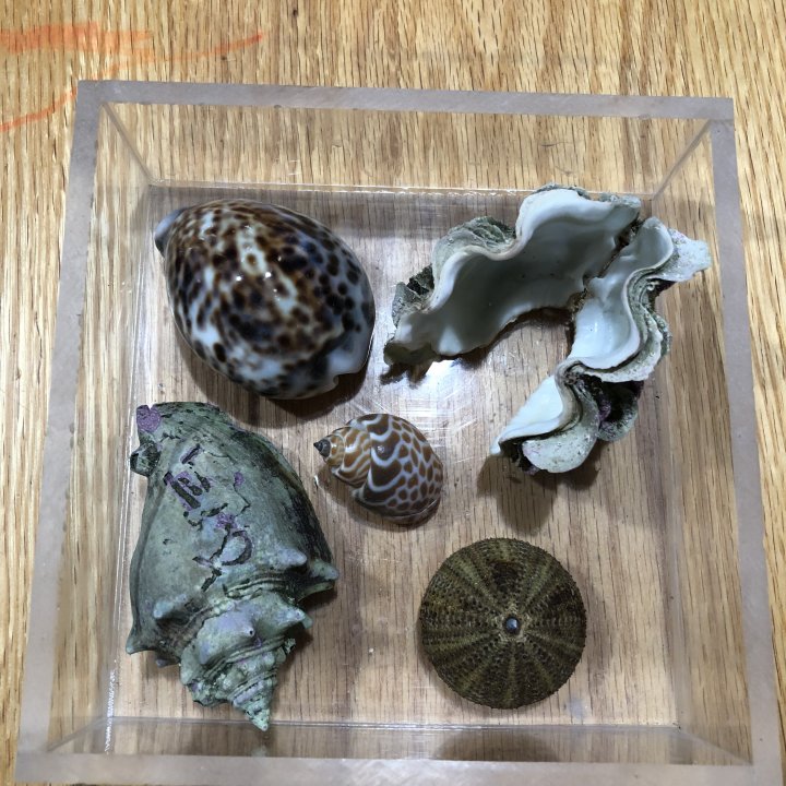 I think I see a clam, a tuxedo or pincushion urchin, a cowrie (?), a conch (?) and another snail species that I am unsure of. Did I get 3 out of 5 at least?