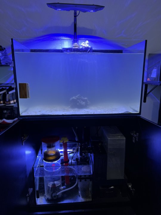 We’re cycled and fish are in from the the Reefer. Decided to keep a pair of my ocellaris clowns here and I’ll put my big female black ice clown in the bookshelf tank.