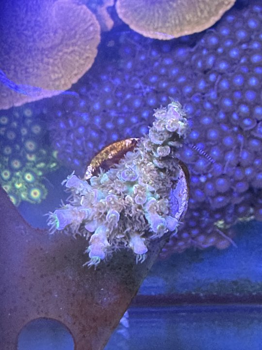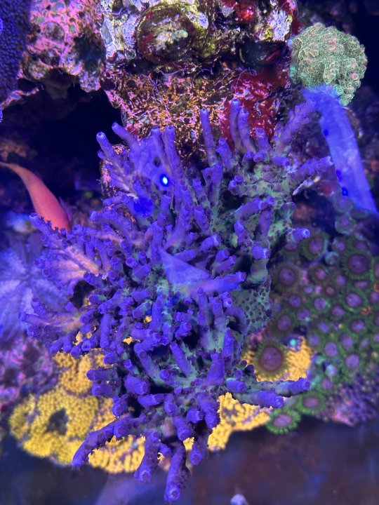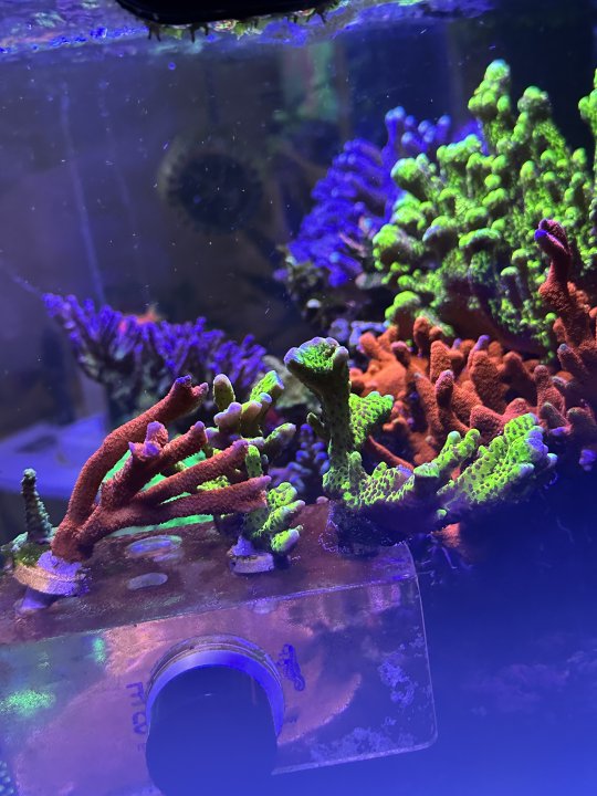 The tank is running on just limewater. The tentative plan is to remove the top right rock once the kalk reactor can't keep up with demand. It seems I am about halfway to maxed out at the moment. If our first baby expected this coming July doesn't tire me out too bad, I may replace that space with some tougher sticks with room to grow upwards. If too tired/busy, I will just start the forest fire digi and spongodes over as frags and remove the rock.