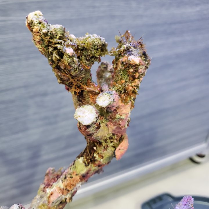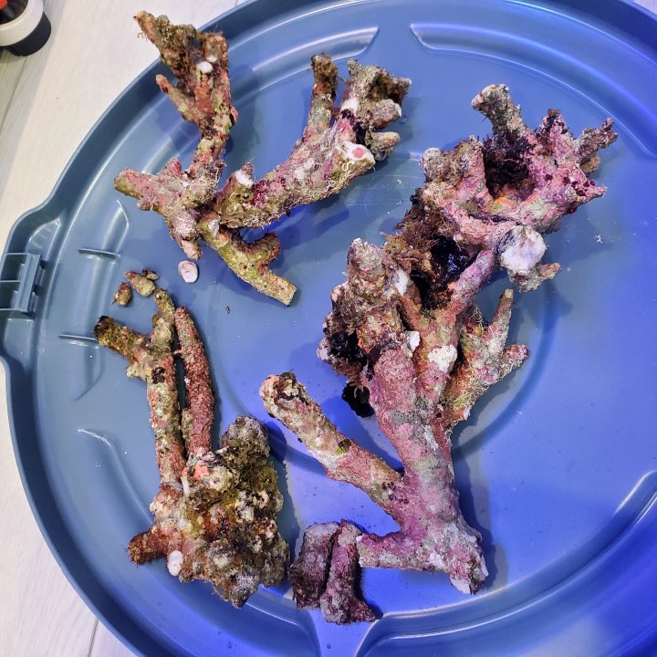 The growth on the rock did have some visible die off. I removed sponges that I knew wouldn't make it and cleaned out a couple bivalves with innards still present. Alot of cool macro algae growth tho. Hot pink to burgundy algae lined a few pieces. They felt rather light except for the biggest one. The shape is very similar to my current scape, and although I'd like to keep it all, will eventually end up selling some to clear up alot of the tank.