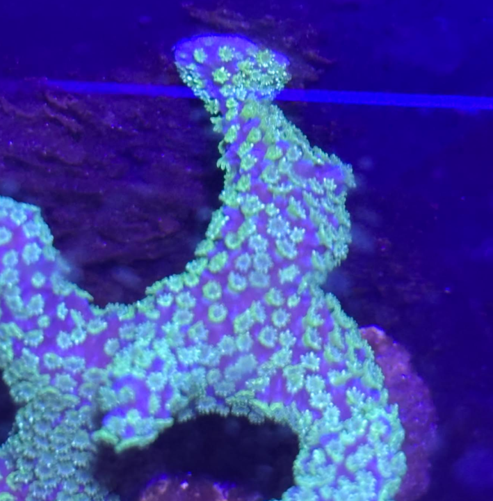 Astreopora is cool, but I don't think that's what that is. The skeleton is much more porous than astreopora should be. It looks identical to what I've been calling "micro alveopora". Not sure if it's actually alveopora, either, but it looks very similar to A. japonica and has 12 tentacles per polyp, so that's what I've been calling it.