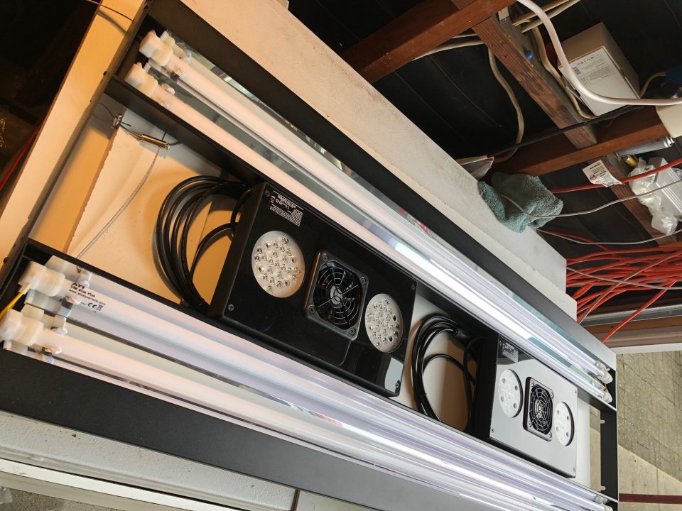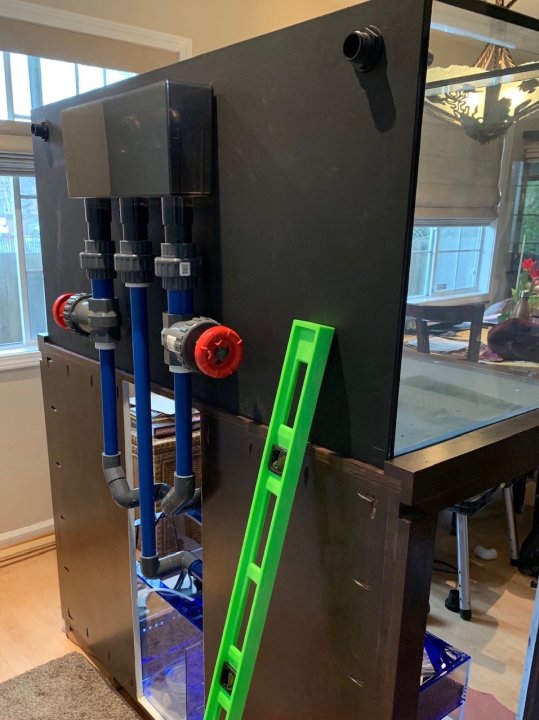 First up was the light and got that out of the way for all the bigger stuff. Then the plumbing for the overflow and return lines. if you look behind the plumbing you can see where it penetrates through the wall into the "laundry room control center". where the Apex system was installed above a table I made for work. Part of the construction was to build a storrage system in the basement right under the laundry room. Again Darshan and Andy got it plumed up and integrated into the Apex system.
