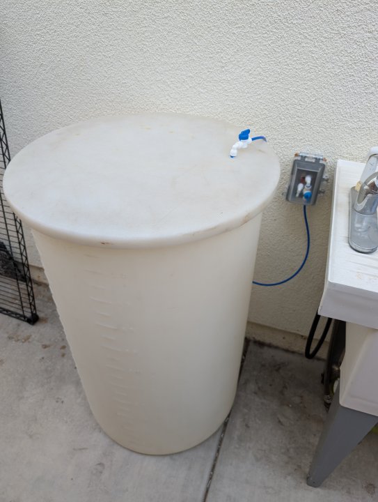 Bit the bullet and drilled a hole through my house directly on the other side of the tank. 55 gallon drum for saturated kalk which will last me about 1.5 months.