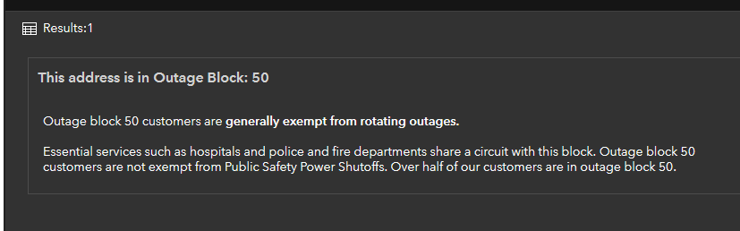 I am disgusted with how energy politics, generation, sourcing, and pricing plays out in this state and would be the first to say that we’re ALL getting the shaft. In this instance some less than others but it’s still BS. The hand that feeds was cut off before the empty one was full of the alternatives. Because my portable AC doesn’t cut it and leaves my place at 85+ degrees inside on a day like this…Lucky you. It’s hard to believe that over half of PGE customers are close enough to a hospital or fire dept to be exempt. I wonder what else qualifies and how much politics or corruption plays a part in drawing those boxes.