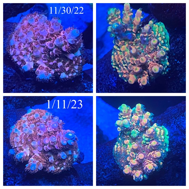 RRU Lady in Pink & BKChem Fruit Loops (Fruit loops got a little sting from a free floating Goni polyp in November that you can see in the pic. Healed up nicely.)