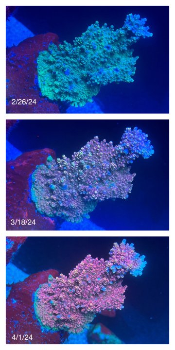 An update on my very likely bacterial infection. I used cipro for a 7-day treatment and everything seemed to go well, then I followed up with a 5-day erythromycin treatment. This is extreme, but the problem I was having kept coming back after a 5-day cipro treatment. Erythromycin was definitely a much harsher treatment than cipro on the coral. Most acros seemed unhappy and went very pale or brown. While most things seem to be on the rebound, I think some coral may be too far gone to recover. I’m cautiously optimistic because last time after a cipro treatment things were good for a bit, to only back downhill again 2-3 months later.