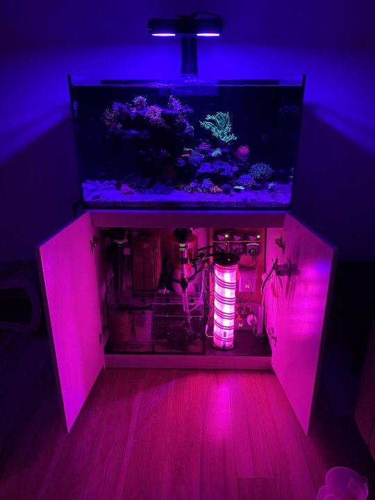 June '21 I removed the UV sterilizer after accidentally breaking the quartz sleeve when cleaning it. I tapped the sleeve just-so-right against the edge of the sump when disassembling. With the UV removed, so too came out the DIY algae reactor I built, as water was supplied by the UV pump's line. I plan to just grow cheato in the front right chamber of the sump with a hanging grow lamp. Simpler to maintain, a lot quieter (I had 500 gph going through the UV), and easier removing detritus that settles in this area of the sump. I don't run socks, so I need to be able to get in here easily to vacuum from time-to-time.