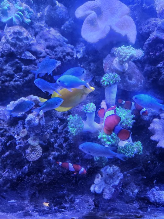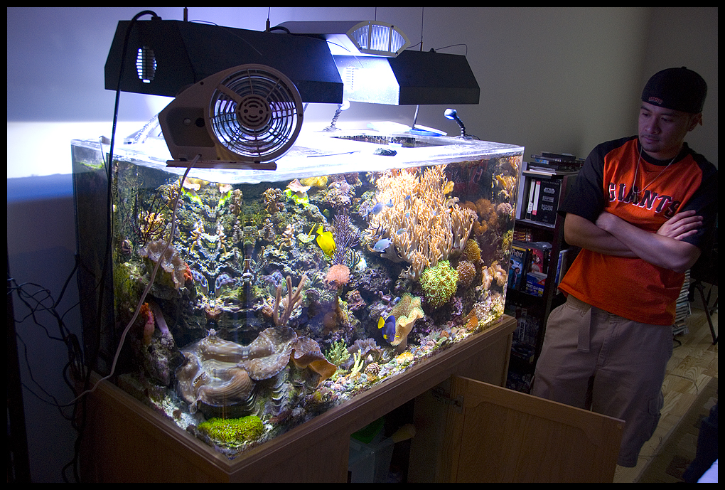 Nice! That's a cool set up. I like all you clams. Does it make any splashing noise as water runs over the edge and down into the 3 inch moat area? Or from the moat, to the sump?Here is an old pic years a ago but you can see the 3 inch moat around the tank to catch the water. It's like an infinity pool basically. I cover the of the so you don't see the return pipe. The drain is by the light pole of the left of picture. You need to get the correct flow on return pump as not to cause too many ripples on the water surface.
