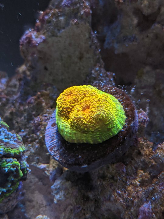 Very nice coloration!Haven’t really been keeping up with my tank journals kind of at all. Maybe need to work on that a little bit lol. Anyway I took a picture today and went back and looked at the very first picture of this particular coral and figured out that I’ve had it in my 75g tank for one year and two weeks. So here is a comparison picture of the growth this OG mummy Eye chalice has given me in a year..
