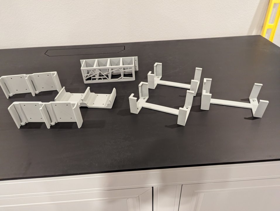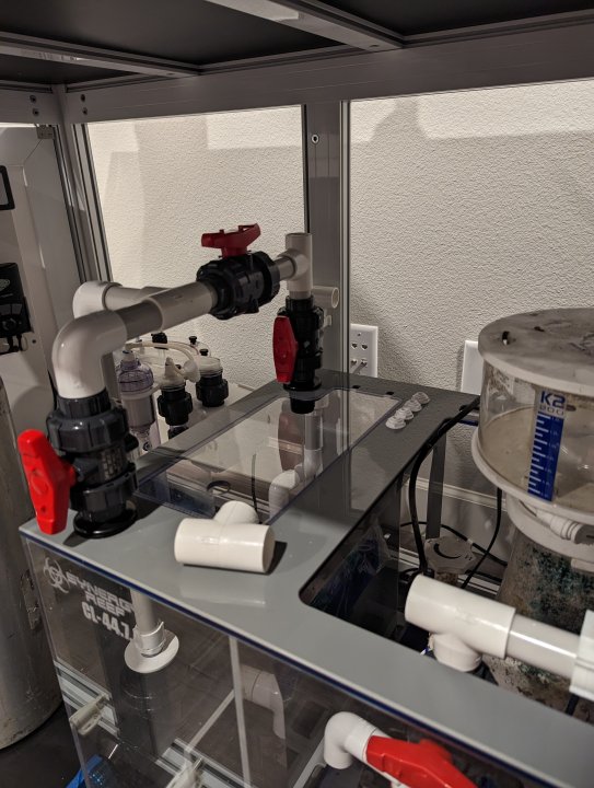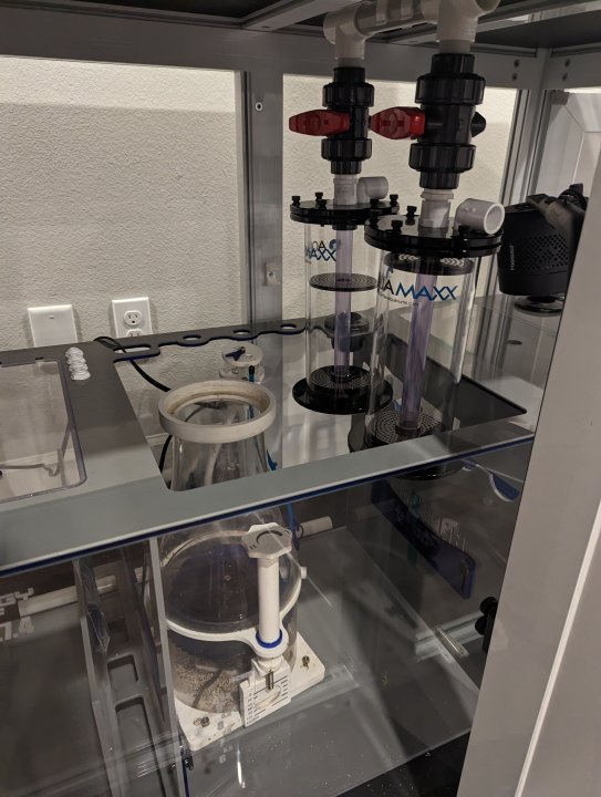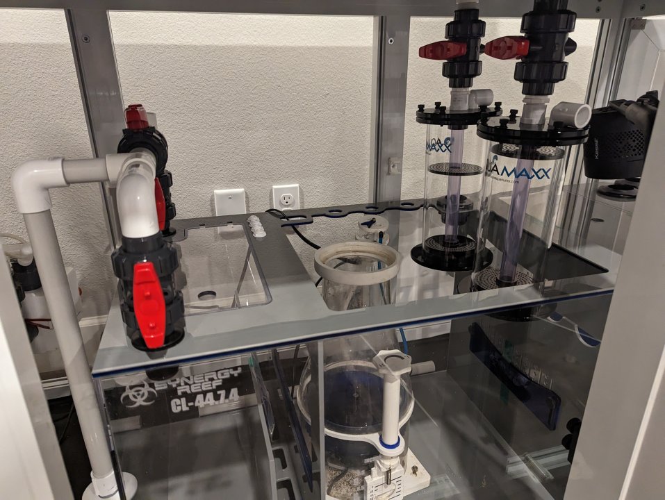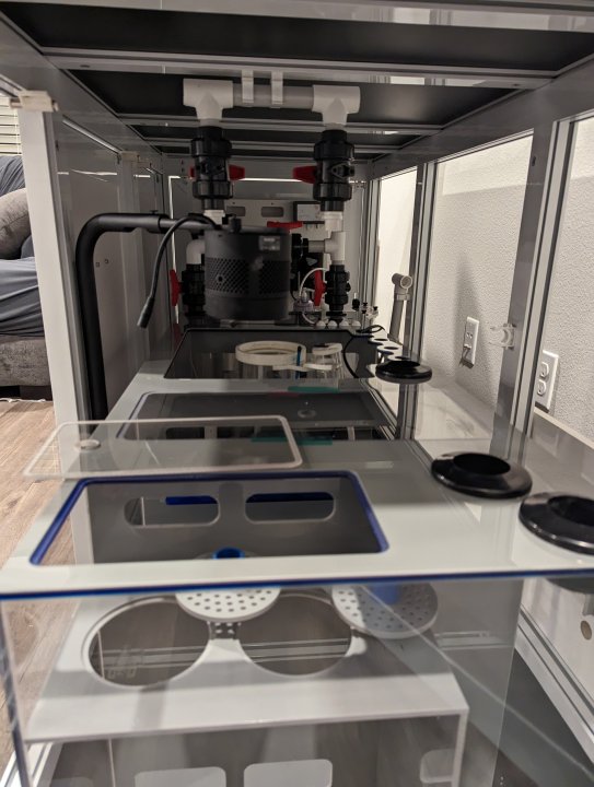 Now that the stand's up, I can start tinkering around with equipment layout and organization as well. I'm trying to prevent the rat's nest of wires that have plagued my prior builds, so I've kept our 3D printer running pretty much constantly to make power brick mounts for XR30s/Vortech/Vectras, as well as controller mounts for the MP40s and Vectras. In addition to the Adaptive Reef controller board I got from