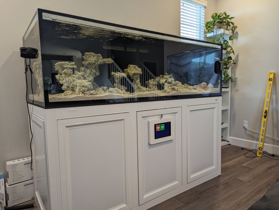 I got the iPad on the front of the tank connected, and loaded up Reef Tiles (by our very own @phatduckk !). I'm not too worried about the pH because 1) low salinity, and 2) the probe was shipped dry, so I don't really trust it. (BRS has already sent me a replacement, and I won't be using this one to monitor anything of importance).