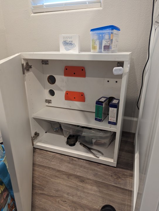 I also forgot about this cabinet I got from a fellow reefer, which matches the stand and can be tucked unobtrusively in this little corner. to minimize clutter, I'll probably run most of the power cords from the heaters, skimmer, etc. into this, and mount an EB832 in there on one of the preexisting mounts.