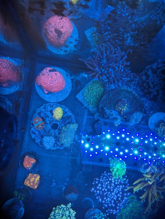 Our dragon soul mini-colony and two heads of dragon tamer from our old tank are almost through QT, as are several favias and our elegance. I put everything I got from the frag swap today into QT tonight (with special thanks to @thephoreefer for a large number of torches I purchased from him, and @Invictus for selling me some stunning chalices), and am currently running one of the XR30 G5's over this 14 gallon tank.