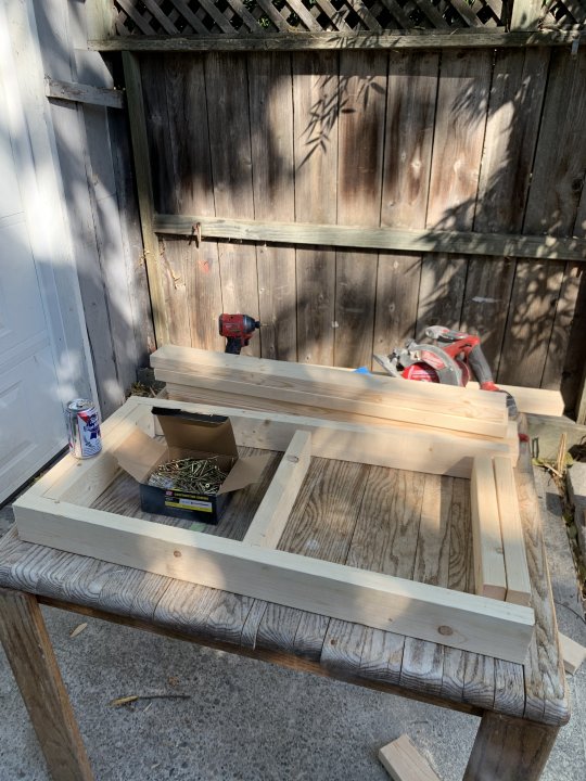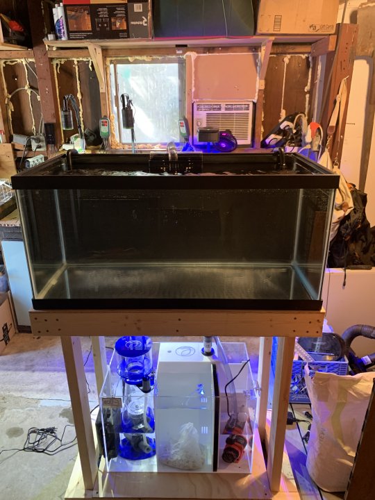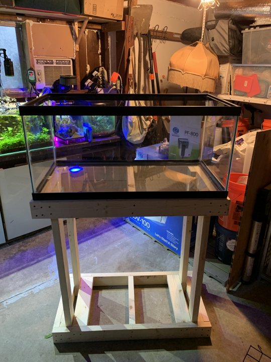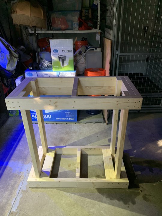 May I make a suggestion? The only thing holding up the weight of that tank are the screws through the vertical supports into the top rim of 2x4's. If you put up 4 more shorter vertical supports that fit between the top and bottom 2x4 frames it will be a few orders of magnitude stronger than those screws or nails. Something like how I did that stand. View attachment 18277