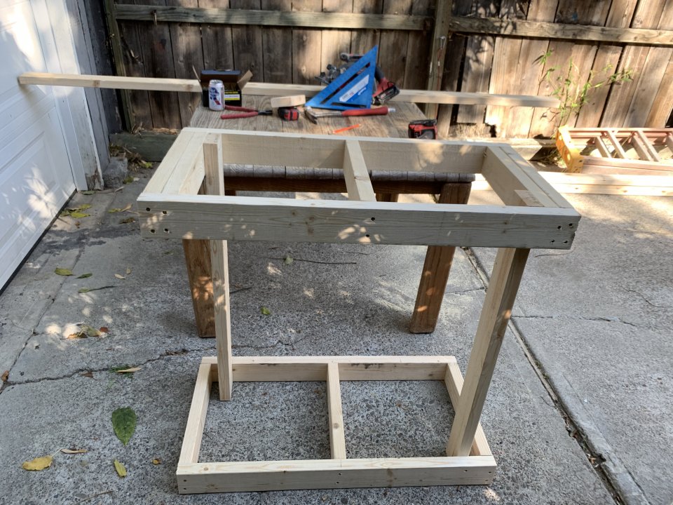 May I make a suggestion? The only thing holding up the weight of that tank are the screws through the vertical supports into the top rim of 2x4's. If you put up 4 more shorter vertical supports that fit between the top and bottom 2x4 frames it will be a few orders of magnitude stronger than those screws or nails. Something like how I did that stand.