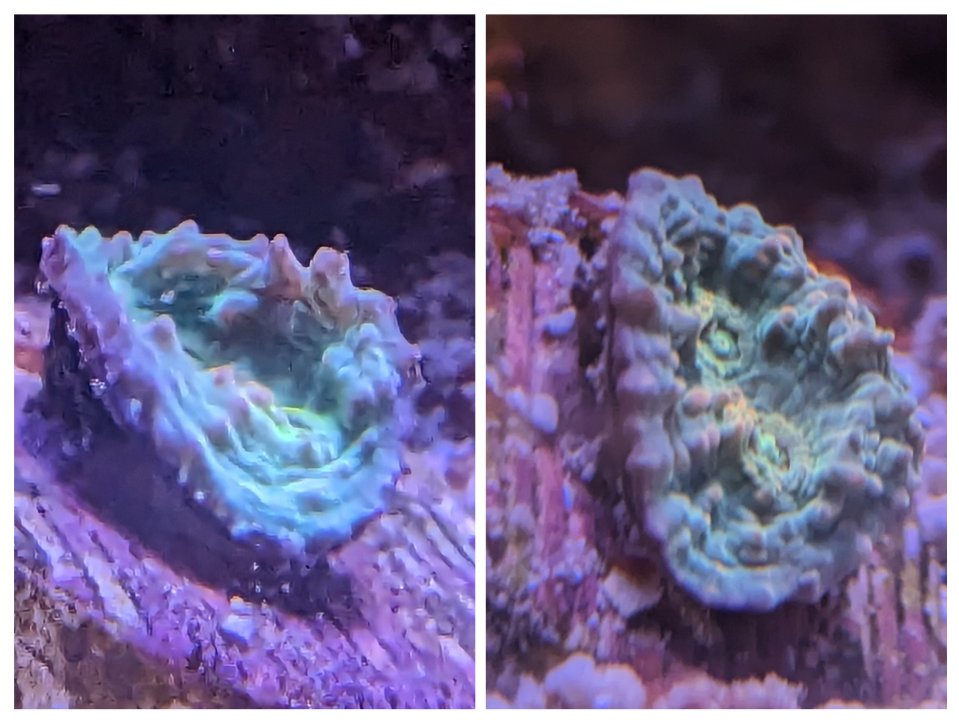 Cranked up lighting by 10% and finally seeing SPS growth and color: