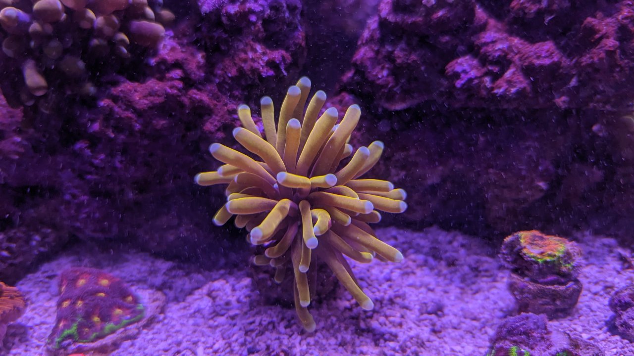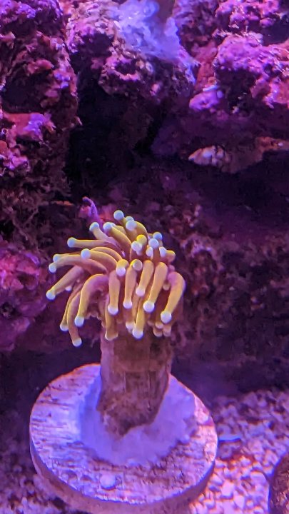 Picked up a Nexus Burst anemone (listed as a 1/4 orange but closer to 1/8 at this point). It's an interesting possibly chimeric bubble tip that can have varying orange or green characteristics depending on how it split. This one is maybe the size of a quarter special ordered at High Tide: