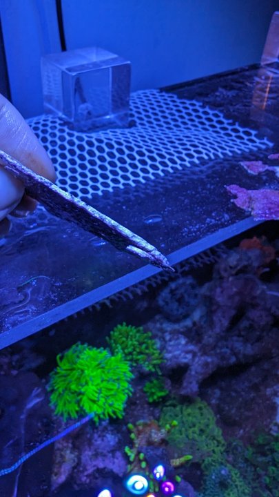 Chipped some coralline algae off the overflow (if anyone wants to see how thick it gets after about a decade of layering and urchin munching: